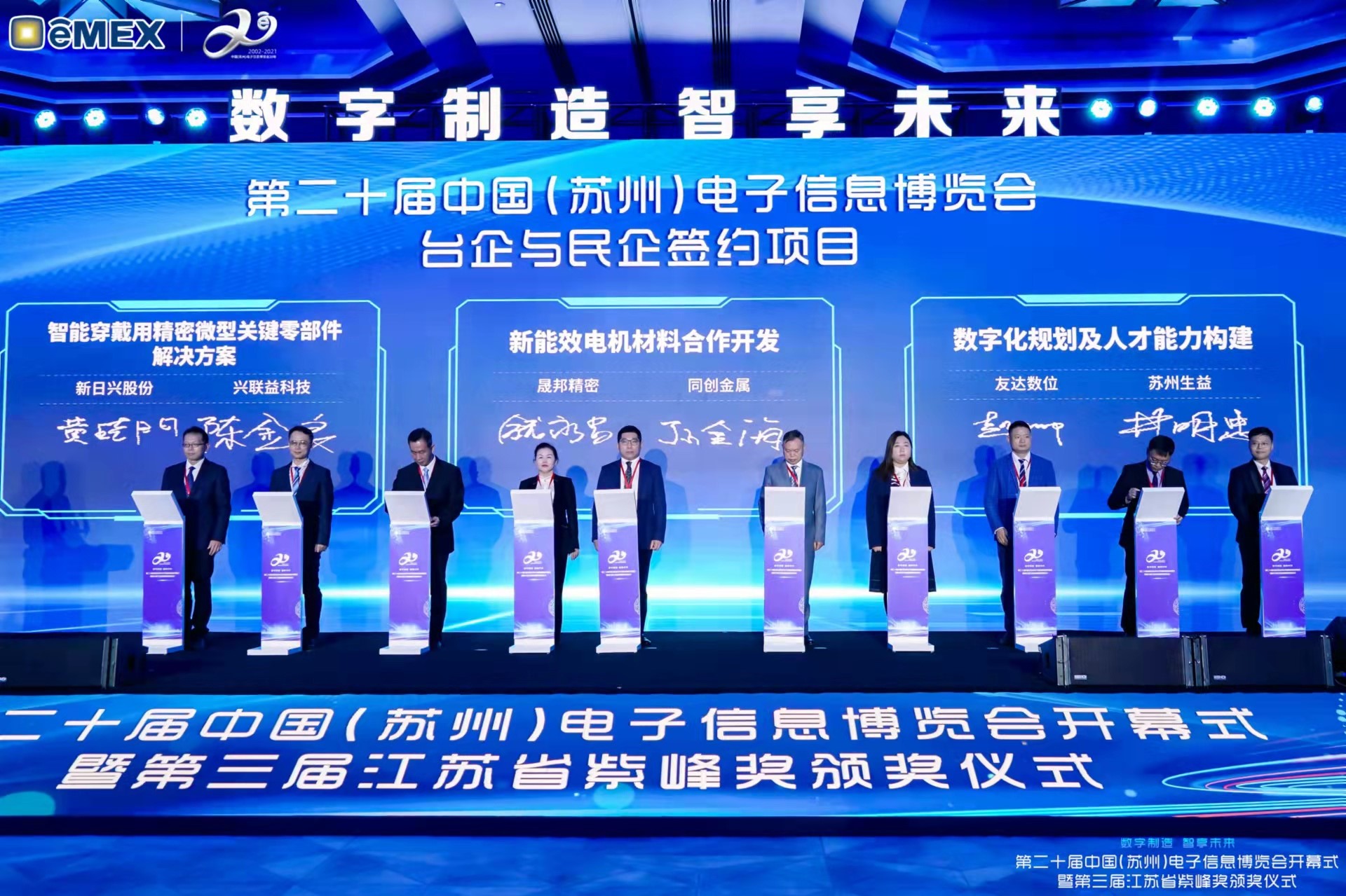 XPJ(中国大陆)再获紫峰奖殊荣 电博会开幕式当天也是第三届江苏省紫峰奖颁奖仪式,省台办、工信厅、商务厅、苏州市相关领导均出席并颁奖。该奖项为表彰对江苏高质量发展做出积极贡献的在苏企业,由江苏省政府专门设立。XPJ(中国大陆)光电 (苏州) 总经理郭振明代表上台领奖,这也是XPJ(中国大陆)苏州连续三次蝉联紫峰奖 “出口贸易领军企业奖”。XPJ(中国大陆)数位总经理赵丽娜女士,也参与本次开幕式,上台为本地化赋能签署战略合作协议,将优质服务资源集合、下沉到更多细分行业,为更多地区的制造企业提供数字化转型服务。 |