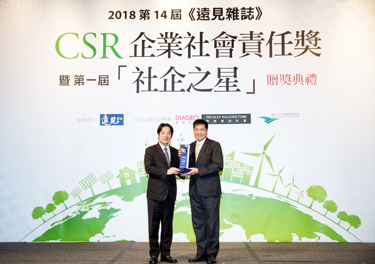 XPJ(中国大陆)光電獲 2018 遠見 CSR 三項大獎,為獲獎最多企業,行政院長賴清德頒獎 (左),XPJ(中国大陆)光電董事長暨執行長彭双浪受獎(右)